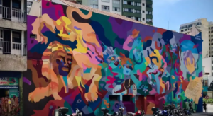 Ali do ladinho do Paço da Liberdade, dois murais se encontram quase que trocando versos.